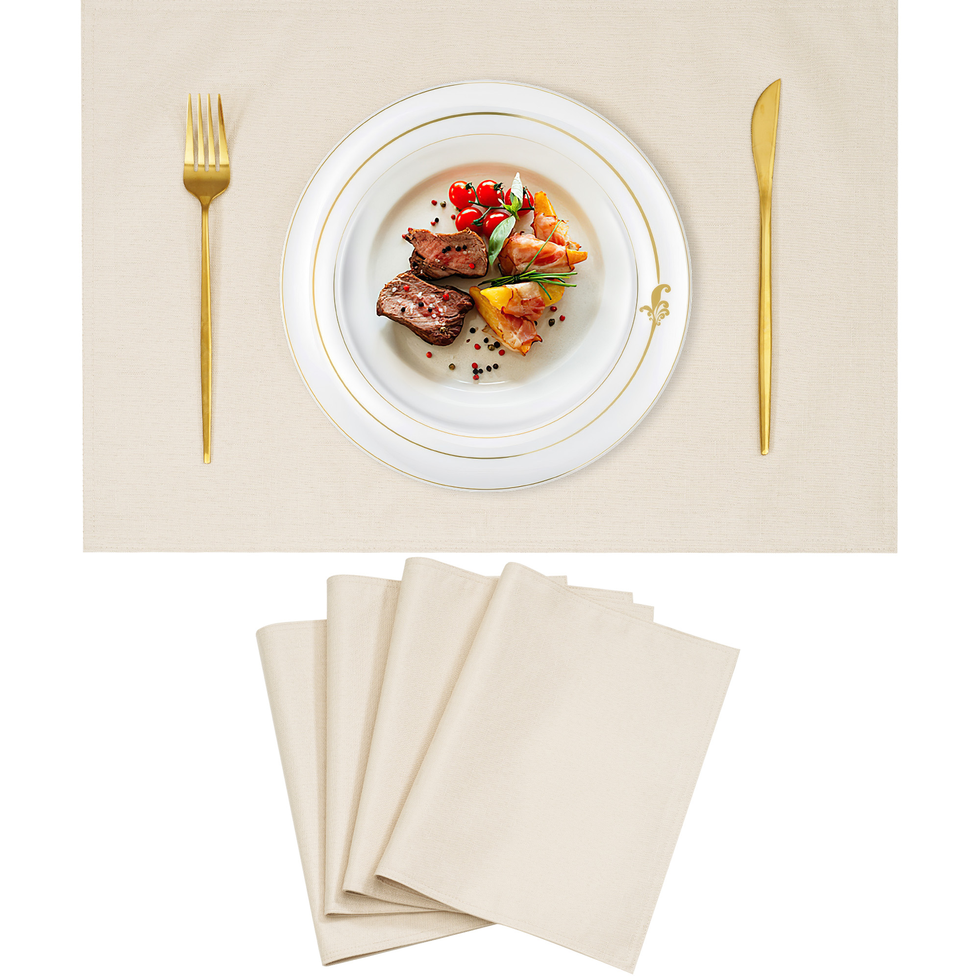 Enjoy a happy time dining with VCVCOO placemats! We created this placemat through exquisite craftsmanship and good design to meet your pursuit of a quality life. Elevate your dining experience with this set of 4 beige placemats. Crafted from a premium polyester and linen blend, these durable and heat-resistant mats protect your table from hot plates, stains, and scratches. The classic design complements a variety of decor styles, making them suitable for everyday use or special occasions like parties, holidays, and gatherings. Machine washable for easy care, these versatile placemats are a must-have addition to your kitchen or dining room.
