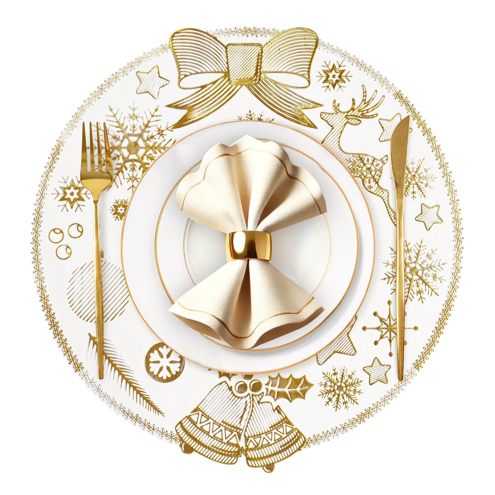 Add a touch of festive elegance to your holiday with our pvc round christmas placemats. Placemats set of 4 features a classic design with a pristine white background and a beautiful, shimmering gold bow, snowflake, elk, jingle bells motif, perfectly capturing the spirit of the season. Measuring a generous 15 inches in diameter, they provide ample coverage for your dining table and protect it in style. Crafted with superior quality PVC, which are not only visually stunning but also incredibly practical. They feature a meticulously heat-cut edge that ensures a smooth, seamless finish without any fraying or rough spots. Cleanup is a breeze—simply rinse with water and wipe dry, and they're ready for your next gathering. Easy to storage, they can be conveniently rolled up, saving valuable space. Elevate your christmas decor and impress your guests with our placemats perfectly blend of beauty and functionality.